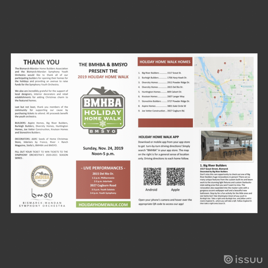 The Bismarck-Mandan Home Builders Association (BMHBA) is excited to partner with the Bismarck-Mandan Symphony Orchestra (BMSO) to present another annual Holiday Home Walk. Proceeds from this event will be presented to the Bismarck-Mandan Youth Symphony Orchestra.
